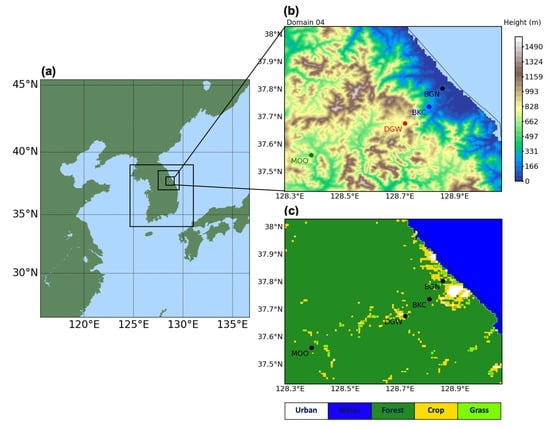 The model used in this study is the WRF Model (Version 4.3.3; []), a fully compressible non-hydrostatic atmospheric model. The domain configuration consists of four two-way nested grids (Figure 1). The horizontal grid spacing is 9 km in domain 1 (240 × 240), 3 km in domain 2 (181 × 181), 1 km in domain 3 (181 × 163), and 0.333 km in domain 4 (211 × 211). There are 68 vertical levels defined on the terrain-following sigma coordinate, and the top of the model is at 50 hPa. The model physics used in this study are as follows. The PBL parameterization scheme of Shin and Hong [] was used for PBL processes to cover gray zone resolution, and the Noah land surface model [] was used for land surface processes. The longwave Rapid Radiation Transfer Model [] and shortwave Dudhia scheme [] were used for the radiation processes.