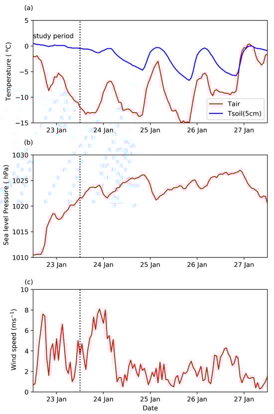 The time series of (a) 1.5-m air temperature and soil temperature at 5 cm depth, (b) sea-level pressure and (c) 10-m wind speed at BGN station from 23 to 27 January 2018. The dotted line indicates the end of study period.