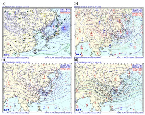 (a) Surface, (b) 850-hPa, (c) 500-hPa, and (d) 300-hPa weather chart at 0000 UTC on 23 January 2018 (Source: Korean Meteorological Administration).