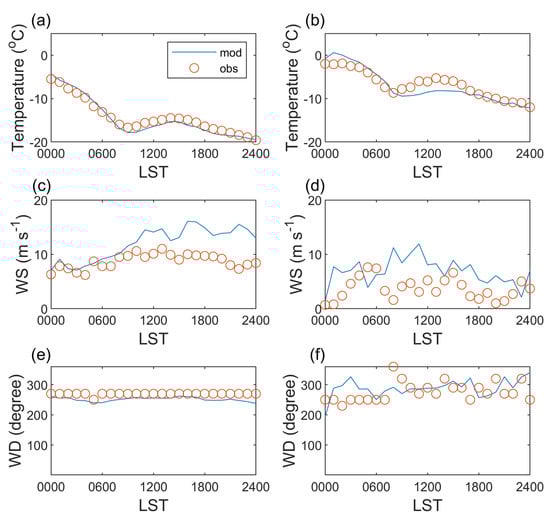 Comparison of 2-m air temperature (a,b), 10-m wind speed (c,d) and 10-m wind direction (e,f) at the DGW (a,c,e) and BGN stations (b,d,f).