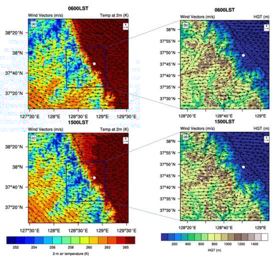 To understand the observed near-surface wind in the complex terrain, we analyzed the horizontal distributions of simulated 10-m wind, and 2-m air temperature at 0600 and 1500 local standard time (LST) in domain 3 (Figure 5a,c). The inner box in Figure 5a,c indicates the study area (domain 4). Cold air is found over the elevated interior of the inland, and the temperature on the ocean side is moderated by the open ocean, resulting in a regional pressure gradient across the coastal mountain range []. Over the ocean and upwind flat terrain, near-surface winds are northwesterly, but over the mountainous area, westerly winds are noted. On the study day, a synoptic-scale pressure gradient was superimposed on the regionally developed pressure gradient, providing favorable conditions for strong westerly gap flow in the mountainous area. The influence of regional pressure gradient force on the near-surface wind was stronger at 0600 LST when the downward transfer of momentum from winds aloft was weak.