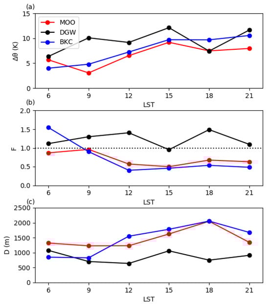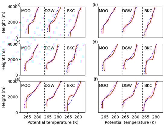Vertical profiles of the observed (solid line) and simulated (dotted line) virtual potential temperature at (a) 0600, (b) 0900, (c) 1200, (d) 1500, (e) 1800, and (f) 2100 LST at MOO, DGW, and BKC sites.