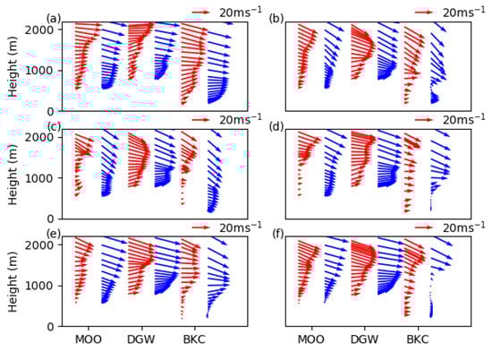 Vertical profiles of the observed (red) and simulated (blue) wind vectors at (a) 0600, (b) 0900, (c) 1200, (d) 1500, (e) 1800, and (f) 2100 LST at MOO, DGW, and BKC sites.