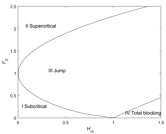 Flow regime of the F0 − Hm diagram for a hydrostatic single-layer flow over an obstacle (from Baines 1995 []). F0 is the upwind flow Froude number and Hm is the obstacle height normalized by the layer depth.