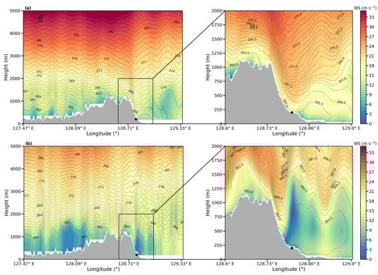 Longitude–height cross-section of the potential temperature (K) and westerly wind speed (m s−1) crossing the BKC site (black dot) at (a) 0600 LST and (b) 1300 LST on 23 January 2018.
