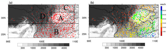 (a) Eastern extension of the Tibetan Plateau and distribution of the selected 444 stations and four sub-regions, Zone A: Sichuan Basin; Zone B: Yunnan–Guizhou Plateau; Zone C: Qinba Mountain area; and Zone D: Eastern part of the Tibetan Plateau; (b) spatial distribution of hourly extreme precipitation thresholds for each station (units: mm/h). The grey shading indicates the elevation (units: m).