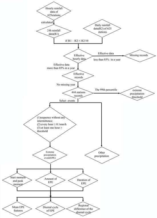 With the selected EPEs, we defined each event its starting moment as the onset moment, and the peak moment of an EPE is the hour (00:00~23:00 Beijing time) when the precipitation reaches the maximum value within the duration. Using the onset moments and peak moments of the EPEs, we analyzed the characteristics of the diurnal cycle of the EPEs and the details of the EPEs over the EETP. Due to the complex terrain, the extreme precipitation has unique evolution characteristics. To research the regional differences in hourly extreme precipitation, the region is divided into four large topographic zones: Zone A: Sichuan Basin; Zone B: Yunnan–Guizhou Plateau; Zone C: Qinba Mountain area; and Zone D: Eastern part of the Tibetan Plateau (Figure 1a). Figure 2 shows the steps used in this paper.