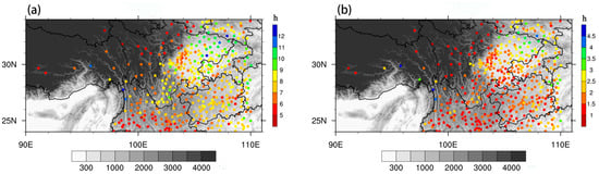 Distribution of (a) average rainfall duration (units: h) for EPEs and (b) the average time required to reach the peak after the start of the EPEs (units: h) in the warm seasons (May–September) during 2004–2017.