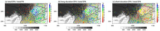 Figure 4 shows the percentages of the EPA to the PA over the EETP during the warm season. The percentage of the total EPA shows a large center with a percentage >30% located over the western Sichuan Basin. In contrast, the percentages in most parts of the Yunnan Province and the eastern part of the Tibetan Plateau are much smaller, with the percentage less than 25% (Figure 4a). In addition, with the long duration, the EPA contributes more than 60% of the total EPA in the eastern part of the Sichuan Basin, the Panxi area, the Qinba Mountain area, and the southern part of Guizhou. Meanwhile, the eastern part of the Tibetan Plateau and the Yunnan Province is dominated by short-duration EPE, which contributed over 60%. The contribution of EPA with long and short durations in the central part of the Sichuan Basin and the northern part of Guizhou is comparable, and both are around 50% (Figure 4b,c).
