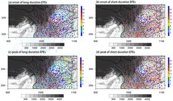 To further analyze the diurnal variation in EPE over the EETP, the peak time corresponding to the onset moments and peak moments of EPE is shown in Figure 5. As shown in Figure 5a, the onset moment of EPE with long duration on the EETP occurs from late afternoon to midnight (17:00–05:00 Beijing time). It can be noted that the onset moment of EPE with long-duration diurnal peaks in the Sichuan Basin and Guizhou appears predominantly between 20:00 and 05:00 Beijing time. On the eastern part of the Tibetan Plateau, the long-duration EPE starts earlier, at 17:00–20:00 Beijing time. For EPE with short duration, in the western and southern parts of the Sichuan Basin, it is still mostly started in the nighttime (20:00–02:00 Beijing time). In contrast, most EPEs with short duration at other stations on the EETP are primarily started in the afternoon and dusk (14:00–20:00 Beijing time), which may be caused by the instability of the lower layer caused by surface radiation heating in the afternoon (Figure 5b). From Figure 5c, in terms of the peak moment of EPE, the EPEs with long duration are more likely to reach the peak at night and midnight (20:00–05:00 Beijing time) in the eastern part of the Tibetan Plateau, western Sichuan Basin, and Yunnan Province, while in the northern Sichuan Basin, Qinba Mountain area, and eastern Guizhou, the peak moments of long duration EPE are primarily in the early morning and morning periods (05:00–11:00 Beijing time). The spatial distribution of the peak moment of short-duration EPEs is similar to the onset moment (Figure 5b,d), and the peak and onset moments of short-duration EPEs are basically in the same period over the EETP. The short-duration EPEs at most stations mainly reach their peaks in the afternoon and dusk (14:00–20:00 Beijing time), while the short-duration EPEs in the western and southern Sichuan Basin mostly reach their peaks at midnight (Figure 5d).