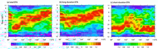 From Figure 6a, the total EPA diurnal peaks over the EETP show an apparent eastward propagation, which begins at 17:00 Beijing time and ends at 09:00 Beijing time the next day. Starting from 16:00 Beijing time, the total EPA reaches its maximum at about 100° E, and then the total EPA spreads eastward until 09:00 Beijing time, spreading to 110° E. The maximum EPA occurs at night over the regions west of 104° E, which may be caused by the instability caused by the radiative cooling at the top of the cloud. The eastward propagation at night may be affected by the clockwise rotation of the southwest wind at the lower level [,]. The long duration of EPA over the EETP is consistent with the total EPA, and there is also a characteristic that the peak propagates eastward from 17:00 Beijing time to 09:00 Beijing time (Figure 6b). In contrast, the peak of short-duration EPA in the area east of 104° E shows a predominant diurnal peak in the afternoon and dusk, about 15:00–20:00 Beijing time. However, the short-duration EPA also has the characteristics of peak eastward propagation in the area west of 104° E, from 14:00 Beijing time to 03:00 Beijing time (Figure 6c). The activity of mesoscale convection systems (MCSs) with a short lifespan on the eastern slopes of the plateau is probably the main cause of this situation. Under the influence of the latitudinal circulation, the MCSs generated in the late afternoon on the eastern slopes of the plateau moved eastward to the western Sichuan Basin during the night, while the descending airflow in the area east of 104° E prevented it from continuing to develop eastward []. It was indicated that the characteristics of the peak of EPA over the EETP propagating eastward at night are mainly determined by long-duration EPEs.