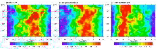 Figure 7 shows the normalized time–longitude distribution of EPA over the EETP. It can be seen that the EPA from south to north over the EETP occurs mainly in the night to early morning (00:00–06:00 Beijing time), only near the 34° N, the diurnal peak of EPA occurs between 18:00 and 23:00 Beijing time. It can be noted that between 28 and 32° N, which is the latitude where the Sichuan Basin is located, the EPA appears a northward propagation of the peak, with the peak first appearing around 28° N at around 21:00 and then propagating northward until 04:00–06:00 Beijing time, when the peak propagates to 32° N (Figure 7a). This suggests that the EPA in the Sichuan Basin has an apparent southwest-to-northeast propagation during the warm season. In previous studies, this unique propagation feature was also present for precipitation in the Sichuan Basin []. As shown in Figure 7b, the long-duration EPA shows very similar latitude–time distribution to the EPA. However, the peaks of the short-duration EPA over the EETP occur mainly in the late afternoon and evening from 15:00 to 21:00 Beijing time, and at 28–30° N, mainly the southern part of the Sichuan Basin and part of the eastern slopes of the plateau; the peaks also occur around 21:00–00:00 and 03:00 Beijing time (Figure 7c). It can be seen that in the meridional direction, the total EPA and the long-duration EPA are dominated by nocturnal rain over the EETP, but short-duration EPA is mainly concentrated in the late afternoon.