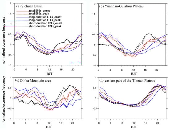 From the previous content, it can be noticed that features of EPE over the EETP have significant regional differences. Figure 8 shows the daily cycle of the normalized times at the onset and peak moment of EPE with different durations regionally averaged over the four subregions. From Figure 8a, it can be seen that for total EPE in the Sichuan Basin, the onset and peak moments are mainly in a single-peak distribution, with the peak of the onset occurring at 01:00, and EPE tends to reach its maximum at 03:00, and the minimum of the onset and peak moments occurring at midday. The diurnal variation in the onset and peak moment of long-duration EPE in the Sichuan Basin is similar to that of total EPE, with maximum occurring at night and minimum at noon, suggesting that the Sichuan Basin is dominated by long-duration EPE. The diurnal variation in the short-duration EPE in the Sichuan Basin shows a bimodal structure of the onset and peak moment. It has a prominent peak at 03:00 at night and a secondary peak at 18:00 in the afternoon, indicating that the short duration EPE is very likely to occur at night and afternoon in the Sichuan Basin, and its minimum still appears at noon. The diurnal variation in the onset and peak moment of total EPE in the Yunnan–Guizhou Plateau shows a bimodal distribution (Figure 8b). There is a peak at 01: 00–03:00 at night and another at 17:00 in the afternoon. The onset and peak moment of long-duration EPE show a unimodal distribution in the Yunnan–Guizhou Plateau, and the maximum value appears at night. For the short-duration EPE in the Yunnan–Guizhou Plateau, the onset and peak moment also show a unimodal distribution, but the maximum value appears in the afternoon. It can be seen that the bimodal structure of the diurnal variation in the onset and peak moment of total EPE in the Yunnan–Guizhou Plateau is mainly dominated by long-duration EPE and short-duration EPE, respectively. Similar to the Yunnan–Guizhou Plateau, the diurnal variation in the onset and peak moment of total EPE in the Qinba Mountain area also shows the bimodal distribution characteristics of one peak at night and one in the afternoon. The EPE, with a long duration in the Qinba Mountain area, consistently tends to occur frequently from late night to the early morning and rarely occurs at noon. In contrast, the short-duration EPE in the Qinba Mountain area appears more often in the afternoon. Compared with the Yunnan–Guizhou Plateau, the diurnal variation in onset and peak moment of the EPE in the Qinba Mountain area shows much more considerable diurnal variability (Figure 8c). All EPEs in the eastern part of the Tibetan Plateau include long-duration EPE and short-duration EPE. The diurnal variation in the onset and the peak moment shows a uniform unimodal distribution. The maximum value appears at 17:00–20:00, and the minimum value appears at noon, indicating that the EPE in the eastern part of the Tibetan Plateau occurs mainly from afternoon to dusk (Figure 8d).