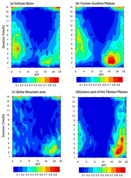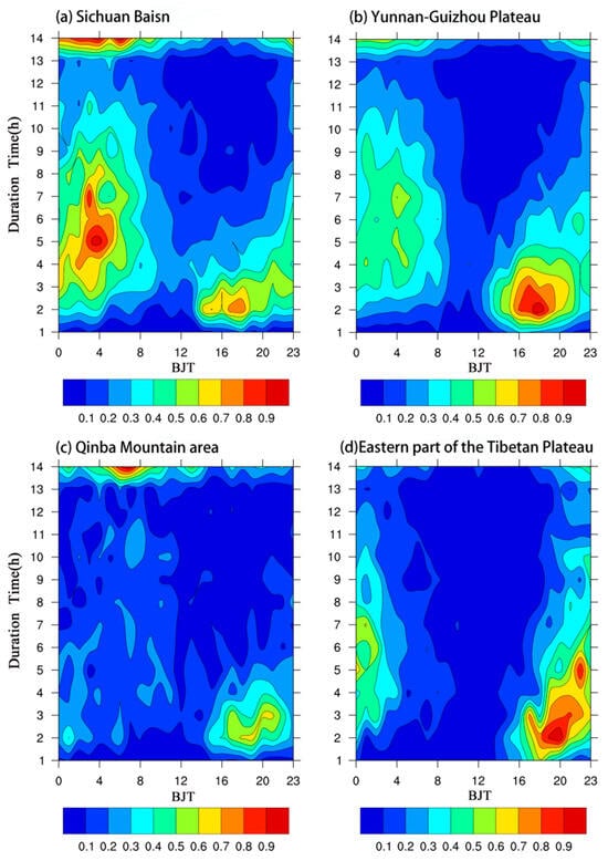 In order to show more clearly and intuitively the diurnal variation in the occurrences of EPE with different durations, Figure 9 and Figure 10 further give the normalized distribution of the start peak moment of EPEs with different durations over the four subregions. As shown in Figure 9a, there are two main types of EPE in the Sichuan Basin. One is an EPE with 4–6 h starting from 02:00 to 03:00 at midnight, and the other is a long EPE with more than 13 h starting at 21:00–02:00 Beijing time. In addition, EPEs with a duration of less than 3 h occur in the Sichuan Basin from 15:00 to 18:00. Still, the probability of occurrence is not as significant as the previous two types of extreme precipitation events. During 08:00–12:00, EPEs do not occur in the Sichuan Basin. Over the Yunnan–Guizhou Plateau, there is dominance of EPEs with a duration of less than 4 h, which starts in the afternoon (15:00–19:00 Beijing time). Meanwhile, the EPEs that started at 17:00–23:00 Beijing time and lasted more than 13 h also occurred more frequently in the Yunnan–Guizhou Plateau (Figure 9b). As shown in Figure 9c, the EPEs with long (short) duration over the Qinba Mountain area mostly start in the night (afternoon), around 20:00–04:00 (17:00–20:00) Beijing time. And almost all other types of EPEs do not occur in the Qinba Mountain area. Compared to the other three subregions, the characteristics of EPEs in the eastern part of the Tibetan Plateau are apparent. It is mainly an EPE that occurs at 16:00–21:00 Beijing time and lasts less than 6 h. EPEs that last longer than 6 h during this period also occur occasionally, while there are no EPEs in the eastern part of the Tibetan Plateau in other periods (Figure 9d).