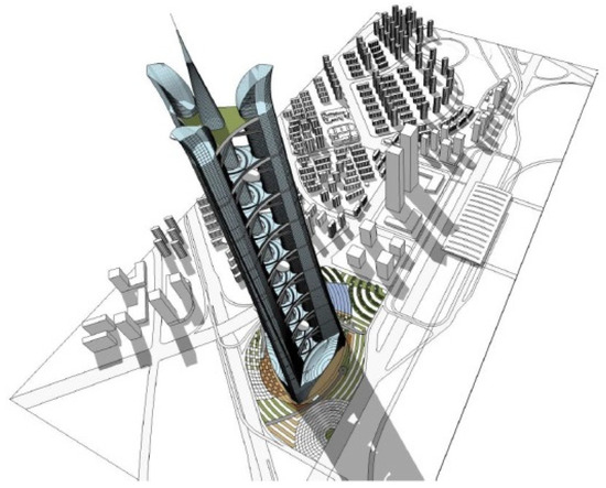 Another aspect related to the pedestrian-level wind environment, which has been less studied, is the pedestrian-level wind environment around the outdoor platforms, balconies, and corridors high up on high-rise buildings. This is usually a very tough and challenging issue for architectural designers because the incoming wind speeds at these places are usually much higher than those near the ground. And the quality of the pedestrian-level wind comfort and wind safety is usually very poor for this kind of issue. Thus, much more attention should be paid to it. In the study by Zheng et al. [24], based on wind tunnel tests and CFD simulations, the pedestrian-level wind comfort and wind safety of the outdoor platforms of a thousand-meter-high megatall building were assessed using the Lawson criterion and NEN 8100 criterion. The megatall building is composed of three equilateral-triangle-arranged tear-drop-shaped towers and a central circular tower, together with ten outdoor platforms at an interval of 100 m along the height to connect the four towers. Figure 1 shows the rendering of this megatall building, and the terrain roughness of the building site can be determined as Category B in the Chinese Load Code. According to reference [24], the results showed that the pedestrian-level wind comfort was very poor in many zones of the most unfavorable outdoor platform with 3 m high wind shields, especially in the passageways of adjacent towers, owing to “funneling effects”. And some potential aerodynamic measures should be studied to improve the wind environmental quality of outdoor platforms to serve as emergency passageways for evacuation or sightseeing platforms.