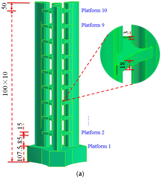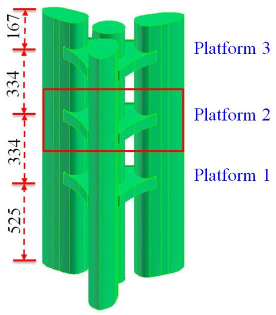 The dimensions of the three-platform sectional model in the vertical direction are shown in Figure 4. It can be seen that every two outdoor platforms were placed at a distance of 334 mm (corresponding to 100 m for the full model), and the distance from Platform 1 to the ground was lengthened to 525 mm to avoid the ground’s disturbance. Figure 5 shows the dimensions of the cross-section of the sub-configuration model and the locations of 18 simplified wind-speed probes on Platform 2. The simplified wind-speed probes, which were developed based on the omni-directional pressure sensor principle [29], were adopted to measure the pedestrian-level wind speeds (at 6.7 mm height above Platform 2). For more detailed information about the simplified wind-speed probes, please see reference [24].