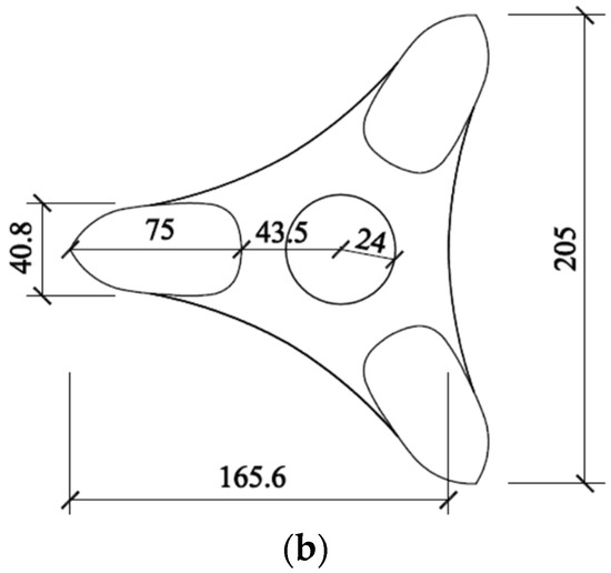 The dimensions of the prototype building model are shown in Figure 2. It can be seen that the height (H) is 1050 m; the maximum distance between the exterior edges of the tear-drop-shaped towers is 205 m, and the maximum distance between each tear-drop tower and the outer edge of the outdoor platform is 165.6 m. To describe the planar dimensions of the full model more conveniently, we use the characteristic size, which is the diameter of an equivalent circle with a same area as that of the cross-section of the model, and its value is determined as 150 m. The diameter of the central circular tower is 48 m.