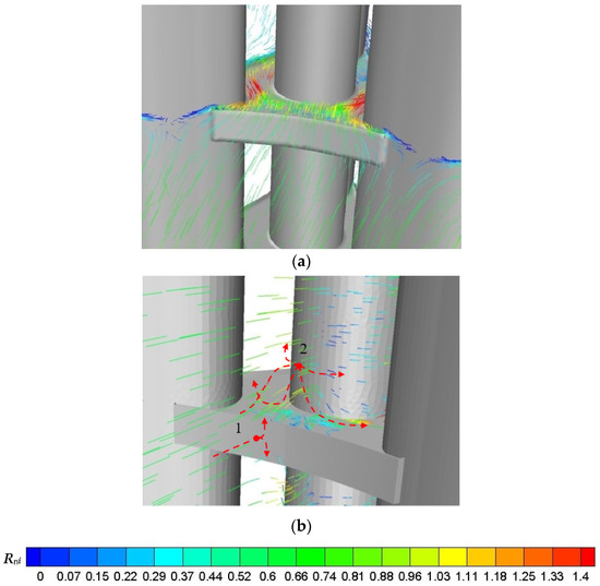 As shown in Figure 3a, when the incoming flow passes into the passage of two upstream towers, it will be contracted gradually, accompanied by a significant acceleration in wind speed due to the “funneling effects”, and the maximum Rni occurs at the narrowest passage. Downstream of the passage, the flow is extended gradually, accompanied by a deceleration in wind speed. Therefore, Rni is greater than 1.0 in the passage zones, with a maximum Rni of 1.6 at the narrowest passage, and is less than 1.0 in the other zones of the platform. To avoid the significant “funneling effects”, extra wind shields could be placed near the narrow passages. In view of this point, a similar measure called a “divider screen” was adopted to improve the wind environment for the outdoor platforms of the Burj Khalifa Tower in Dubai [28]. Moreover, some roadside trees could be planted near the narrow passages to reduce the wind speed for practical considerations.