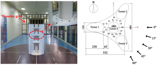 The wind tunnel test was conducted in the Joint Laboratory of the Wind Tunnel and Wave Flume located at Harbin Institute of Technology, China. The dimensions of the small test section are 4.0 m in width, 25.0 m in length, and 3.0 m in height. Owing to the restraint of the blockage ratio, less than 5%, and the requirement of sufficient probes, a three-platform sectional model (also called the “sub-configuration”, see Figure 4) with a length scale of 1:300 was employed as the test model. And Platform 2 was selected as the research object to investigate the pedestrian-level wind environment. For more information about the determination of the test model, please refer to reference [24].