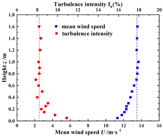 According to reference [24], the pedestrian-level wind environment on Platform 2 was determined as the most unfavorable under the condition of the uniform inflow. Therefore, the uniform inflow condition is utilized as the velocity-inlet in the wind tunnel test, and the incoming wind speed is set at 13.5 m/s when considering that the simplified wind-speed probes have a higher measurement precision at higher wind speeds [29]. Thus, the reference wind speed, Uer, is 13.5 m/s, and the wind-speed scale is 1:4.374. So, the Reynolds number of the wind tunnel test model is about 4.658 × 105. In addition, the turbulence intensity, Iu, of the generated wind flows is set at a constant with the value of 0.0821 according to the specification for the terrain roughness of Category B in the Chinese Load Code [26].