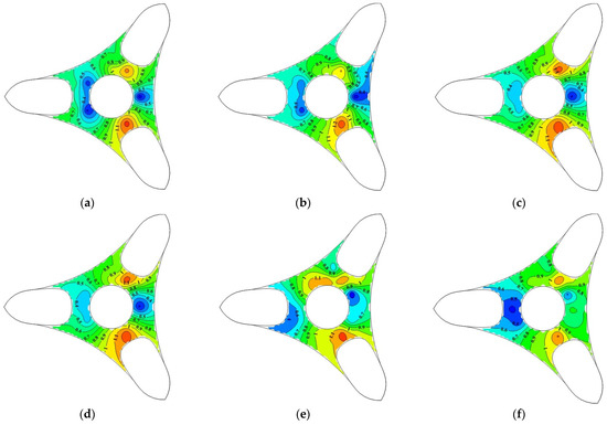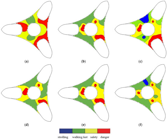 As shown in Figure 19a, most areas in the baseline model (3 m wind shield) outdoor platform cannot satisfy the wind comfort level, and many areas are at the “danger” level. It can be seen in Figure 19b–f that aerodynamic measures, such as increasing the height of the wind shield (from 3 m to 5 m), further adding a deflector or a suppressor, and using double wind shields, can effectively increase the area of the outdoor platform to satisfy the requirements of “walking fast” but cannot satisfy the requirements of “strolling”. Therefore, the “safety” level on the platform is effectively improved after adopting different aerodynamic measures. The “danger” area is reduced, and many areas are gradually transformed to the “safety” or “walking fast” areas. That is, more areas on the outdoor platform can satisfy the requirements for safe evacuation in an emergency.
