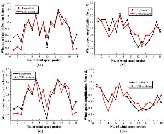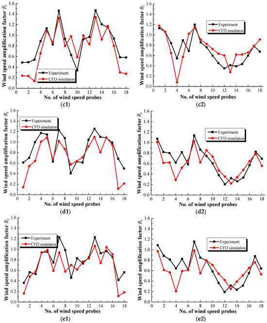 To further analyze the errors between the experimental data and CFD results, Table 3 shows the relative errors of the wind-speed probes for which the experimental data, Rei, are greater than 1.0 (focusing on the accelerated wind-speed zones) in the 0° and 60° wind directions. It can be seen that the maximum error is 27.71% (located at probe 7# in test case 5) in the 0° wind direction, and the average error for these probes is only 21.64%; however, in the 60° wind direction, the discrepancies are relatively smaller than those in the 0° wind direction, with a maximum discrepancy of 14.57% (located at probe 7# in test case 5) and an average discrepancy of 12.52%, indicating good agreement between the experimental data and CFD results. The reason for the discrepancies can be attributed to two aspects: First, there are some errors in the processes of model manufacturing and measuring in the wind tunnel test; second the realizable k-ε turbulence model used in this paper has some defects in simulating complex flows, such as the flow separation, vortex shedding, and wake flows around bluff bodies with complicated configurations. In general, the CFD numerical simulation based on the RANS approach can more accurately predict the wind-speed distribution. In addition, the relative errors of test cases 4 and 5 are generally higher than those of the other aerodynamic measures, and the possible reason can be attributed to the flow field for the cases with double wind shields, which are more complex.
