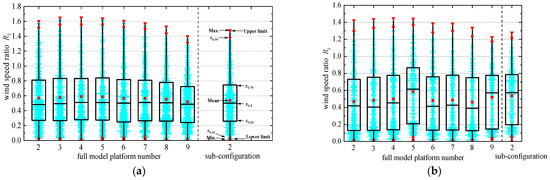 Box plot of Ri on outdoor platforms in the full and sub-configuration models: (a) 5 m wind shield +1 m wind deflector; (b) 5 m + 5 m double wind shields, L = 9 m.