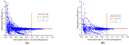 The wind-speed adjustment coefficient, CR, is defined as the ratio between the pedestrian-level Ri on the most unfavorable wind environment platform in the full model and those on Platform 2 in the sub-configuration model. Figure 11 shows the variations in the CR values for the pedestrian-level Ri in the sub-configuration model. The results show that the change in CR is very large (from 0.05 to 5.85) for Ri < 1.0, and when the Ri values are greater than 1.0, the CR values gradually converge to a constant. Considering that the wind discomfort and wind danger are mainly caused by high wind speeds, the Ri values greater than 1.0 are retained to calculate the average CR. Therefore, the average CR is determined as 1.15 and 1.1 for the 5 m wind shield +1 m deflector and 5 m + 5 m double wind shield models, respectively. The Ri values acquired by the wind tunnel test should be multiplied by CR to be used in the wind-comfort assessment.