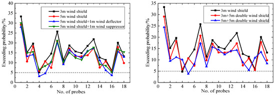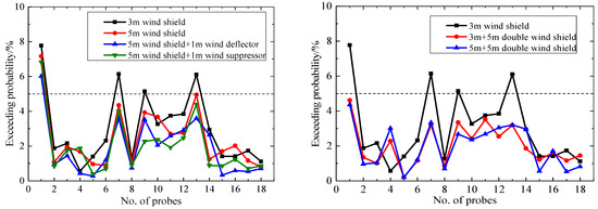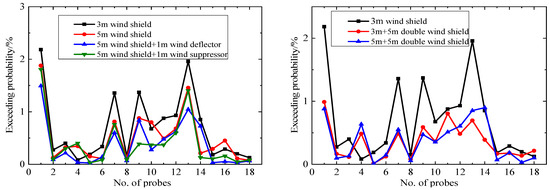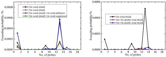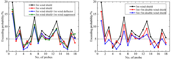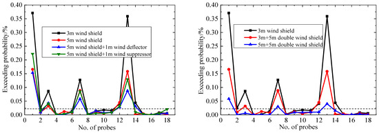 Figure 17 indicates that the probabilities for the equivalent hourly mean wind speed exceeding 20 m/s under different aerodynamic measures are less than 0.022%, especially for the double wind shields for which the exceedance probabilities are close to 0. Figure 18 indicates that the aerodynamic measures significantly reduce the probability of an hourly mean wind speed above 20 m/s at the pedestrian-level compared to the 3 m wind shield. The maximum exceedance probability of the 18 probes decreased from 0.37% to 0.17–0.22%; the reduction was over 42%, and the wind environment has been significantly improved. Except for probes 1#, 3#, 7#, and 13#, the wind-speed threshold exceedance probabilities of all the probes are less than 0.022%. So, most areas of the platform satisfy the wind safety requirements.
