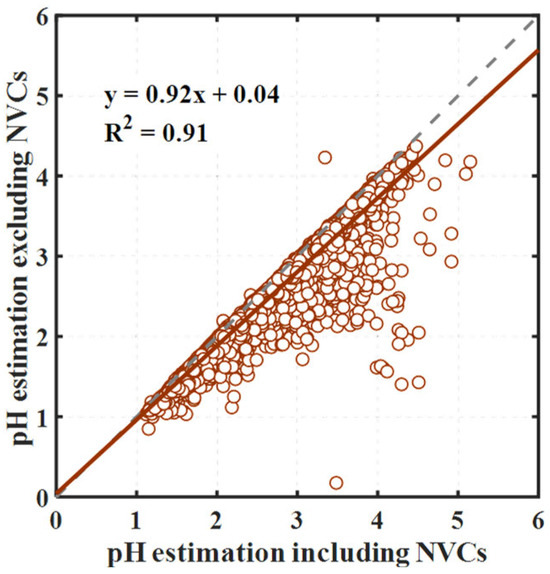 Moreover, we assessed the influence of non-volatile cations (NVCs) on aerosol pH, an area where ISORROPIA-II particularly excels. This assessment is crucial for benchmarking against other models. Generally, the pH values determined with and without the inclusion of NVCs exhibited strong correlation (R2 > 0.9), but the exclusion of NVCs tends to lead to an overestimation of acidity (average pH underestimated by 0.18 units), as shown in Figure 3. Notably, significant deviations from the regression line in some samples indicate a more substantial underestimation of pH in these instances. Hence, while the overall trends align closely, the underestimation observed in certain samples underscores the importance of including NVCs in pH estimations.