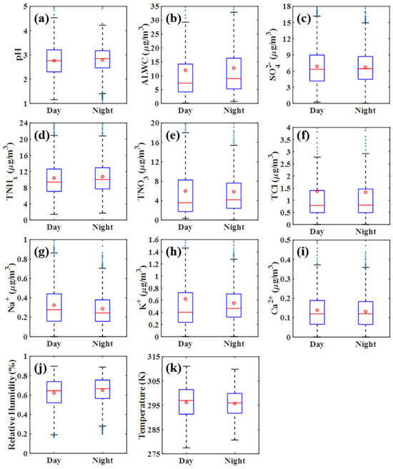 Comparative overview of daytime and nighttime aerosol pH, ALWC, meteorological parameters, and water-soluble inorganic species. ALWC represents aerosol liquid water content; represents the summation of in the gaseous phase and in the particulate phase; represents the total nitrate, including gaseous and particulate ; represents the total chloride, including gaseous and particulate . Other ions used in the figure refer to commonly understood terms and are not explicitly defined here for brevity. Subfigures (a–k) correspond to pH, ALWC, , TNHx, TNO3, TCl, , , , relative humidity, and temperature, respectively.