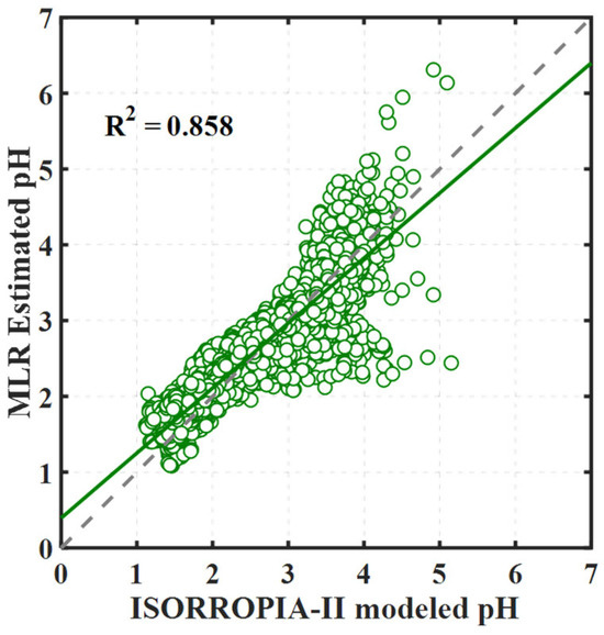 Comparison of aerosol pH as calculated by ISORROPIA-II and estimated through MLR. The green circles are the data points, the solid green line represents the regression fit, and the dashed gray line is the 1:1 correspondence line.
