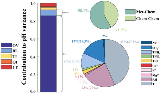 We quantified the relative contributions of various factors to the overall variation in aerosol pH. As illustrated in Figure 6, meteorological parameters predominantly influenced the variation in aerosol pH, surpassing the impact of chemical species. This finding aligns with previous reports indicating that meteorological factors contribute more significantly to pH variations than chemical components in aerosols in the PRD region [14] and in Eastern China using sensitivity analysis [12]. Specifically, temperature was the most influential factor, accounting for 37.3% of the pH variation, followed by humidity, which contributed approximately 20%. This observation aligns with the findings from previous research, indicating a 0.1 unit augmentation (reduction) in aerosol pH corresponding to a 2.0 K decrement (increment) in temperature [34]. Temperature affects aerosol acidity in multiple ways: it influences the gas particle partitioning of secondary components, impacts the absorption of water vapor, and significantly affects the dissociation of sulfate ions in aerosols [35]. Moreover, temperature is a crucial parameter affecting non-ideality. Relative humidity directly influences the liquid water content of aerosols, thereby determining the concentration of in water and affecting the dissociation of sulfate ions [36]. It should be noted that, despite having one of the smallest coefficients in the MLR equation at −0.05, temperature notably makes the largest contribution to the variance in pH. This discrepancy is because the input parameters use different scales and units (as shown in Table S1 in the Supplementary Materials). Therefore, the magnitude of a variable’s coefficient does not directly indicate its importance.