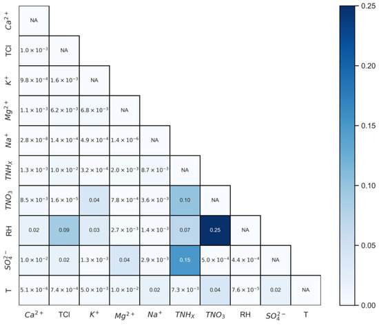 Upon further analysis, it was discovered that, by incorporating trivariate and quadrivariate interactions, the explanation for pH variation in aerosols could be elevated to 96.2%, with the contributions from trivariate and quadrivariate interactions being 2.3% and 1.0%, respectively (Figure 6). Although overall the contributions of trivariate and quadrivariate interactions to aerosol pH variation are less significant compared to the direct contributions of parameters and bivariate interactions, they nonetheless enhance our understanding of aerosol pH variation to some extent, aiding in comprehending the factors affecting aerosol acidity. For instance, in trivariate interactions, the contribution of –T reached ~7%, which may be tentatively explained by a possible competitive interaction between sulfuric and nitric acids as acidic substances, influenced by the volatility of and the non-volatility of , thereby making their competition sensitive to temperature variations [40]. This highlights the importance of interactions between key acidic and alkaline components and meteorological parameters. In quadrivariate interactions, –RH contributed 8.1%, which could possibly be explained by ammonia and calcium ions neutralizing acids, chloride participating in acid–base reactions, and humidity affecting the solubility and reactivity of these components, underscoring the significance of the interplay between relative humidity and various chemical components. However, it is important to note that our statistical approach does not guarantee that the contributions of all interactions can be perfectly explained through physicochemical mechanisms. For example, has a relatively high proportion in trivariate interactions, but it is challenging to find an appropriate explanation from a physicochemical perspective. Therefore, while we can ascertain the contributions of these interactions to pH variation, the specific contribution of each group should not be over-interpreted and must be approached with caution.