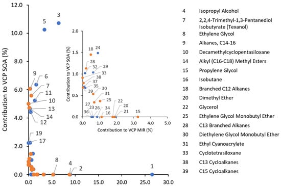 Contributions of the top-ranked compounds to total VCP emissions weighted by ozone MIR and SOA-yield in the 2019 U.S.-wide emission inventory from VCPy. All 39 compound numbers are identified in Table S1, and the 18 compounds considered “poorly represented” are named here and colored orange, whereas 21 “well represented” compounds are colored blue.