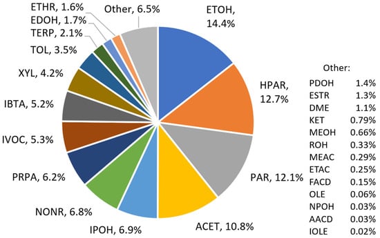 To perform this analysis, we mapped each of the top 200 compounds to CB6 and VCP mechanism species, as shown in Table S2. Figure 2 shows the percentage of carbon mapped to each CB6 and VCP mechanism species, with 67.2% of C mapped to existing CB6 species (including NONR and IVOC) and the remaining 32.8% of C mapped to VCP mechanism species. (Percentage of C can be computed from lumped mechanism species whereas percentage mass cannot). In Figure 2, mechanism species NONR (non-reactive) represents compounds with long atmospheric lifetimes, such as halocarbons, that are not considered as ozone or SOA precursors for regional modeling. The model species IVOC represents intermediate-volatility organic compounds (defined in VCPy as having 3 × 102 µg m−3 < C* < 3 × 106 µg m−3) which are not part of CB6 but are treated by many air quality models [,,]. Compounds within the top 200 that are mapped to NONR or IVOC are identified in Table S2 and the methodology for mapping volatile and reactive compounds to VCP and/or CB6 compounds (as in Table S2) is discussed below.
