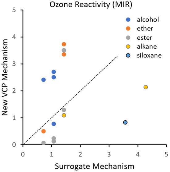 MIR factors (mole O3/mole VOC) for VCP species in the new VCP mechanism compared to a “surrogate mechanism” approach of representing each VCP species using PAR. The dotted line indicates a 1:1 relationship.