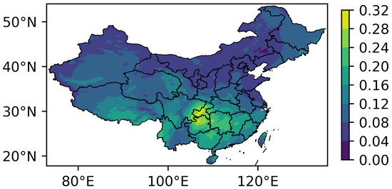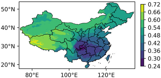 Figure 1 shows the spatial distribution of the 37-year averaged (December 1983 to November 2020) clearness index in China. The average value is 0.51. The atmosphere clearness is higher in the northern and western regions and lower in the southern and eastern regions. The highest atmosphere clearness occurs in the western Xizang, with a value of 0.66 (the 0.99 quantile). The high clarity over the area is attributable to the thin atmosphere [40] and dry climate [41]. The clearness index is the lowest in the border areas among Sichuan, Chongqing, and Guizhou, with a value of 0.03 (the 0.01 quantile). The area is downstream of the Tibetan Plateau and abundant with water vapor, clouds, and precipitation.