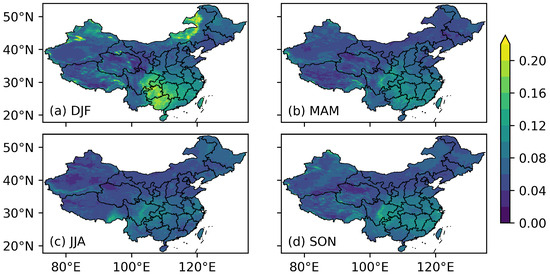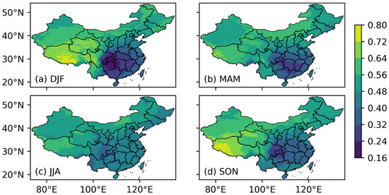Figure 3 and Figure 4 intercompare the seasonal and interannual variabilities in the clearness index. For fair intercomparisons, the variabilities are normalized by the multi-year averaged climatology. The normalized variability is also referred to in the literature as the coefficient of variability. In most territories of China, the seasonal variability is overwhelming in magnitude over the interannual variability. The coefficient of seasonal variability is 0.11 on average. It is more significant in the areas from the southern Tibetan Plateau to western Yunnan, northeastern China, and eastern Sichuan Basin than in the other regions of China. The seasonal variation of the Indian monsoon [52], Northeast cold vortex [53], and East Asian monsoon [54] play a role in these three regions, respectively. The interannual variability has a similar spatial distribution to the seasonal variability. However, its magnitude varies with seasons. The average coefficient of interannual variability is 0.082, 0.065, 0.061, and 0.067 for winter, spring, summer, and autumn, respectively. Winter has the largest variability, as shown in Figure 4a. It is interesting to notice that topography plays an important role. The phenomenon is evident in the Tianshan, Qilian, and Xing’an Mountains in autumn and winter; however, the reason is unclear and needs further investigation.