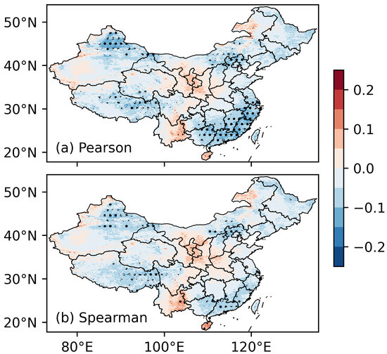 Correlation between the clearness index and the Niño-3.4 index. (a) Pearson’s correlation coefficient, and (b) Spearman’s correlation coefficient. Black dots denote the areas with a significance level of 0.1.