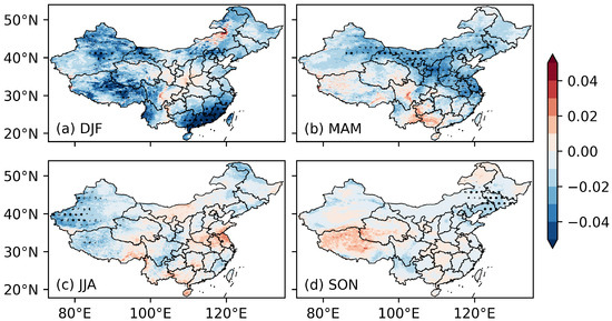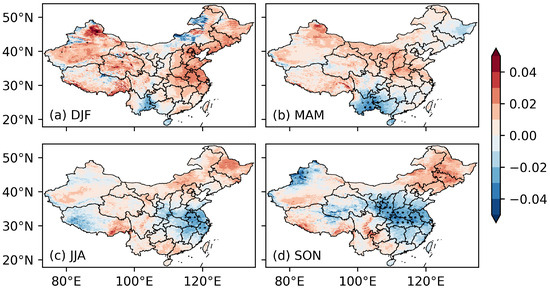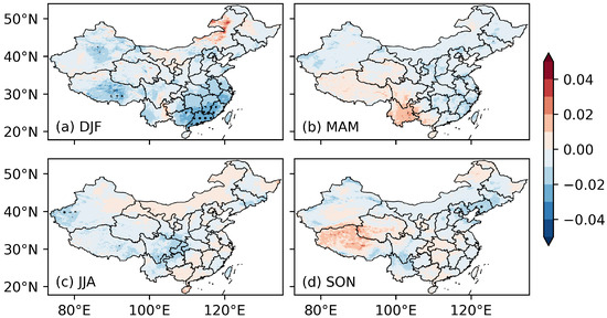 Averaged seasonal anomalies in the clearness index during the El Niño events. Black dots denote the areas with a significance level of 0.1. The four panels (a–d) present winter (DJF), spring (MAM), summer (JJA), and autumn (SON), respectively.