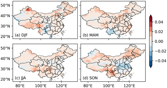Figure 7 is the same as Figure 6 but averaged over all the La Niña events. In contrast with the El Niño events, the La Niña events increase the clearness index in most areas of China. This increase would be the result of an enhanced northeasterly wind anomaly during the La Niña events [25]. In spring, autumn, and winter, the anomaly patterns are the reverse of the El Niño events. Compared to the El Niño events (Figure 6d), the anomaly magnitude for the La Niña events is larger, especially in autumn and eastern Yunnan and northeast China (Figure 7d). It is also interesting to note that the summertime anomaly (Figure 7c) is not the reverse of the El Niño events (Figure 6c), except in southwest China. The anomalies in southwest China may be due to the variations in the Indian monsoon. In other areas, we hypothesize that the clearness index is a result of competing impacts from the Indian monsoon and the East Asian monsoon [59]; this hypothesis needs further investigation.