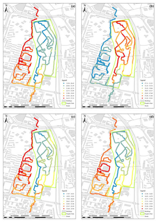 (3) Through discussion, it is found that the two evaluation indexes of thermal comfort show a significant positive correlation under the two methods of mobile monitoring and fixed-point detection. The heat index and wet-bulb globe temperature were significantly correlated with temperature and humidity, positively correlated with temperature, and negatively correlated with humidity, similar to the findings of related studies. Wind speed has a weak effect on improving the thermal comfort of the park, but it has been observed that wind speed and shading are the two main variables that influence the human comfort index [14]. Combined with the results of regression analysis, it is suggested that the park and its vicinity should appropriately increase trees and pools for cooling down and humidification to improve the thermal comfort of the park. Ventilation corridors through urban parks can promote shade and ventilation and improve thermal comfort, so the layout and pruning of plants should be considered in the design, not only taking into account shade and ventilation but also the prevailing local wind direction and season.