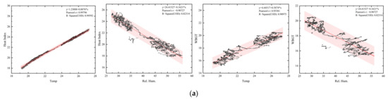 Through the analysis of mobile monitoring data, it can be seen that temperature and humidity may affect thermal comfort. Therefore, heat index and wet-bulb globe temperature were set as Y variables, temperature and humidity as X variables, and a 95% confidence interval was set. The fitting curve obtained is shown in Figure 6.