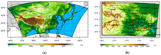 Domains used in the WRF simulations: (a) first domain D01, (b) third domain D03. The rendered colormap denotes the elevation. Major cities are marked as black dots. The greater Wuhan area as analysis region is encircled by red rectangle.