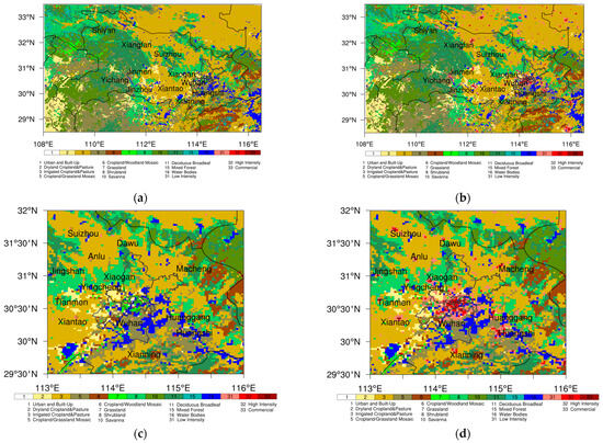 Land cover types of USGS classification for domain D03 in: (a) 1986 and (b) 2018 and for the greater Wuhan area in: (c) 1986 and (d) 2018.