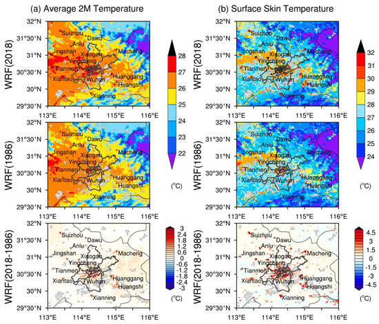 Differences of WRF simulated (a) average 2 m temperature and (b) average surface skin temperature between experiments URBAN_2018 and URBAN_1986.