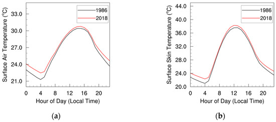 Simulated diurnal variations of (a) 2 m air temperature and (b) surface skin temperature from the experiments URBAN_2018 and URBAN_1986. Values are averages over all urban grid cells in 2018.