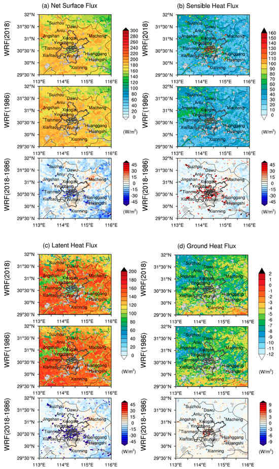 Differences in WRF simulated (a) net surface radiation, (b) sensible heat flux, (c) latent heat flux, and (d) ground heat flux between experiments URBAN_2018 and URBAN_1986.