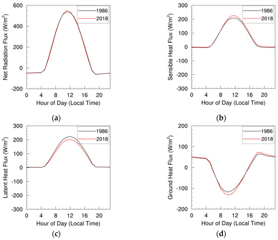 The diurnal variations of the surface energy components are compared between experiments URBAN_2018 and URBAN_1986 for the urban grid cells in 2018, as illustrated in Figure 8. When compared to URBAN_1986, the URBAN_2018 simulation results in small changes to the surface energy budget over urban areas. Our results show an increase in sensible heat flux with a magnitude of 5.1 W/m2 and a decrease in latent heat flux with a magnitude of −13.6 W/m2 averaged over the urban grids in 2018. These effects are much greater in daytime than in nighttime. Ground heat flux decreases with a magnitude of −3.2 W/m2 averaged over the urban grids in 2018. It decreases during the daytime (storage of absorbed solar energy), while it rises in the nighttime (release of the energy from the urban ground).